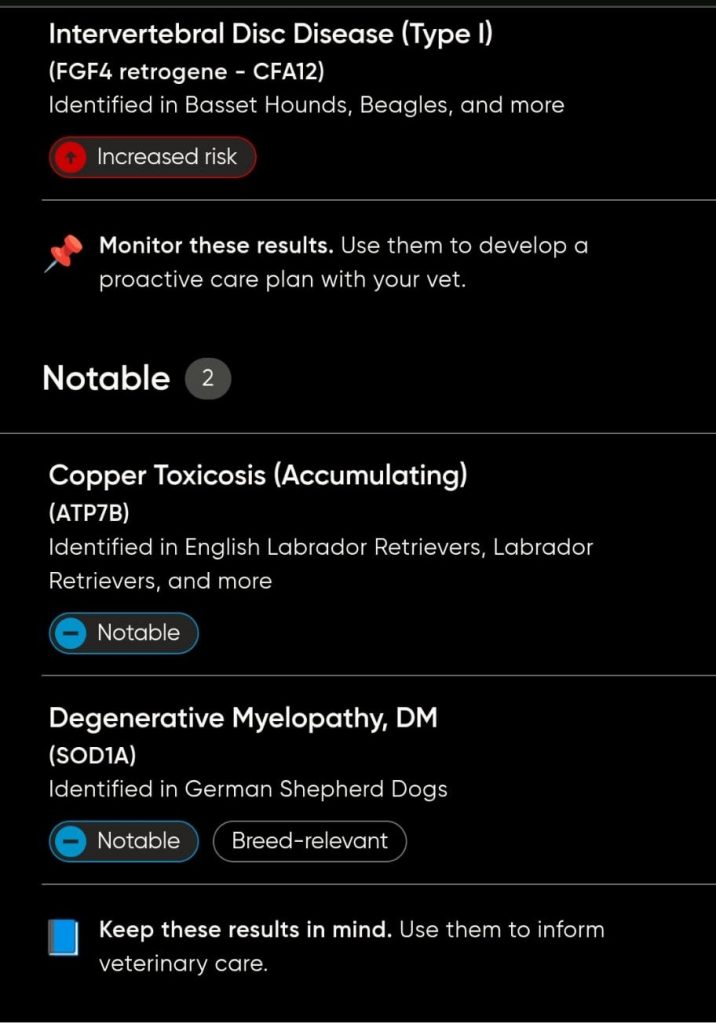 Wir haben das Gesundheits-Screening mitgebucht. Wichtig vorweg: Ein genetischer Hinweis aufgrund des DNA Tests ist keine Diagnose, aber wir wollten wissen, ob in Woodys DNA typische Marker stecken, die später zu Komplikationen beim Hund führen könnten.
